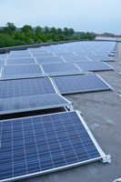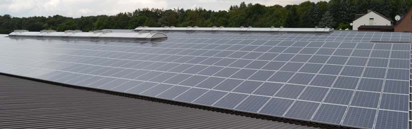 Diese Photovoltaikanlage mit 96kWp wurde mit unserem neuen Ost-West-Montagesystem umgesetzt. Die Dachlast und die notwendige Ballastierung konnte erheblich gesenkt werden. So sind unsere Solarkraftwerke auch für Industriehallen mit geringen Lastreserven geeignet. Die Wartungsgänge verlaufen nicht mehr in der Tiefsicke, sondern zwischen jeder zweiten Modulreihe am "First". So kann die gesamte Dachhaut jederzeit inspiziert werden, ebenso die komplette Elektrik. Die Hitze unter den Modulen lüftet laufend ab, die Erträge steigen. Der Wechselrichter ist regelmäßig von 10:00-14:00 optimal ausgelastet. | |