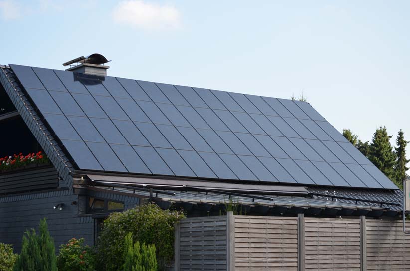 Mit einer Gesamtleistung von 13kWp erzeugt diese Anlage den doppelten Energiebedarf der Haushalte und versorgt auch die Nachbarschaft. Und die Photovoltaikanlage wird zunächst garnicht als solche wahrgenommen. | |